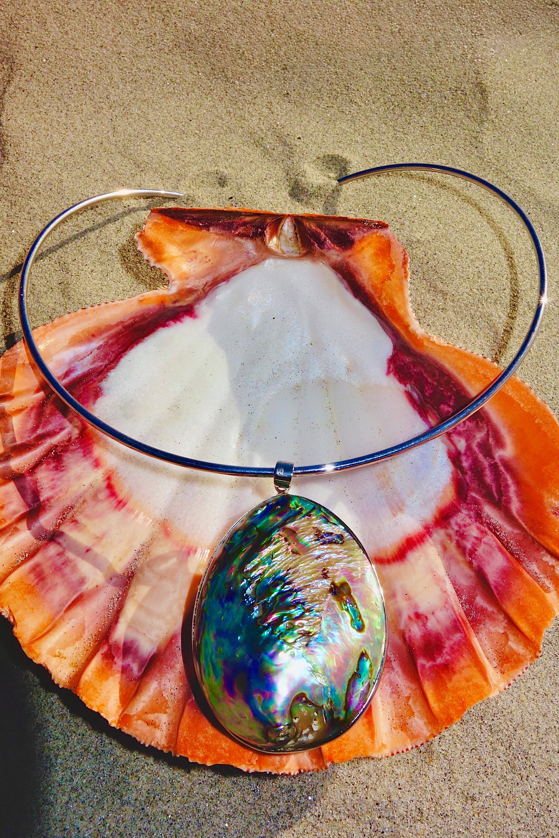Evoke the shimmer of the sea with this bold, iridescent pendant handcrafted from genuine abalone shell. Suspended from a sleek silver-toned choker, the teardrop-shaped shell glows with rich hues of emerald, violet, and ocean blue—each one naturally formed and one-of-a-kind. Whether worn alone as a statement or layered for boho-luxe flair, Aurora Tide brings a raw elegance only nature can create.